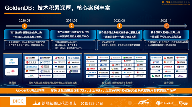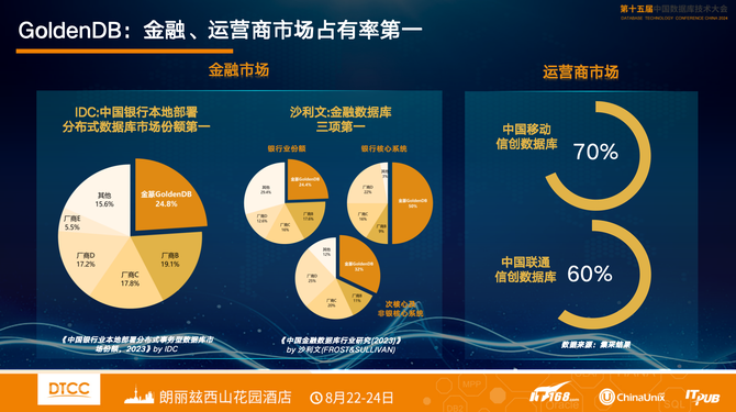 上图是第三方机构的数据,分别是IDC、沙利文的调研结果,以及GoldenDB在运营商投标中标的情况。在金融和运营商领域,GoldenDB在分布式改造方面取得了显著进展,对此我们深感荣幸。同时,我们也要感谢监管单位和客户对我们的帮助和支持。