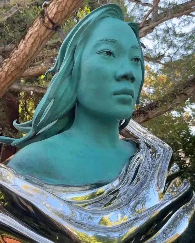 这座雕像是由美国艺术家丹尼尔·阿尔轩(Daniel Arsham)创作,以银色和蓝绿色为主色调,展现了陈穿着银色斗篷享受微风的姿态,斗篷的后半部分被制作成了翅膀的形状。