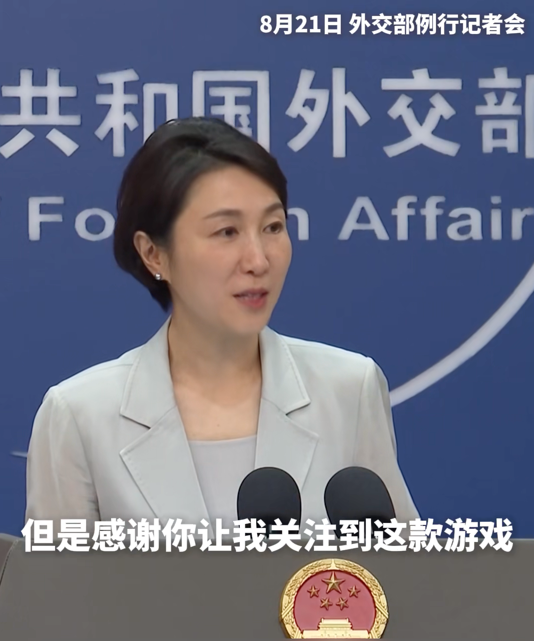 8月21日,外交部发言人毛宁主持例行记者会。有记者问,中国游戏《黑神话:悟空》周二全球火爆推出,其中的中国文化元素令玩家印象深刻,请问发言人有何评论?毛宁表示,我不了解电子游戏,但是感谢你让我关注到这款游戏。从名字看,这款游戏取材于中国古典文学名著《西游记》,我想这也反映了中国文化的吸引力。