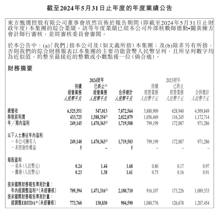 DoNews8月24日消息,东方甄选今晚发布公告,截至 2024 年 5 月 31 日止年度,总营收约 70.73 亿元,同比增长 56.82%;公司拥有人应占溢利 17.195 亿元,同比增长 77%;经调整溢利约 21.81 亿元,同比增长约 1 倍;基本每股盈利 1.68 元。