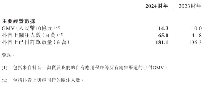 东方甄选公司于 2024 财年的 GMV 增加 43% 至 143 亿元。其中来自抖音的 GMV 占公司 GMV 的大部分,来自应用程序的 GMV 占公司总 GMV 的 8.4%。于 2024 财年,抖音上第三方产品及自营产品的已付订单总数由 2023 财年的 1.363 亿单增至 1.811 亿单。