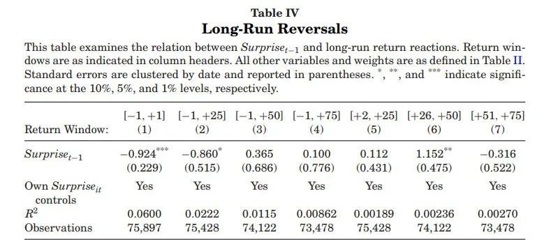 如果回报模式代表了由于对比效应导致的心理偏差引发的错误定价,那么 的负系数应该会随着时间推移而反转,因为价格最终会回归到基本价值。表4考察了公告发布后的回报,并发现了在50个交易日内显著的反转。第一个列复制了基线情况,专注于短期的回报反应。列2到4则关注更长期的回报窗口,从t-1开始,最长到t+75。研究发现,对比效应在25个交易日内持续存在,但在公告后50个交易日变得与零无显著差异。