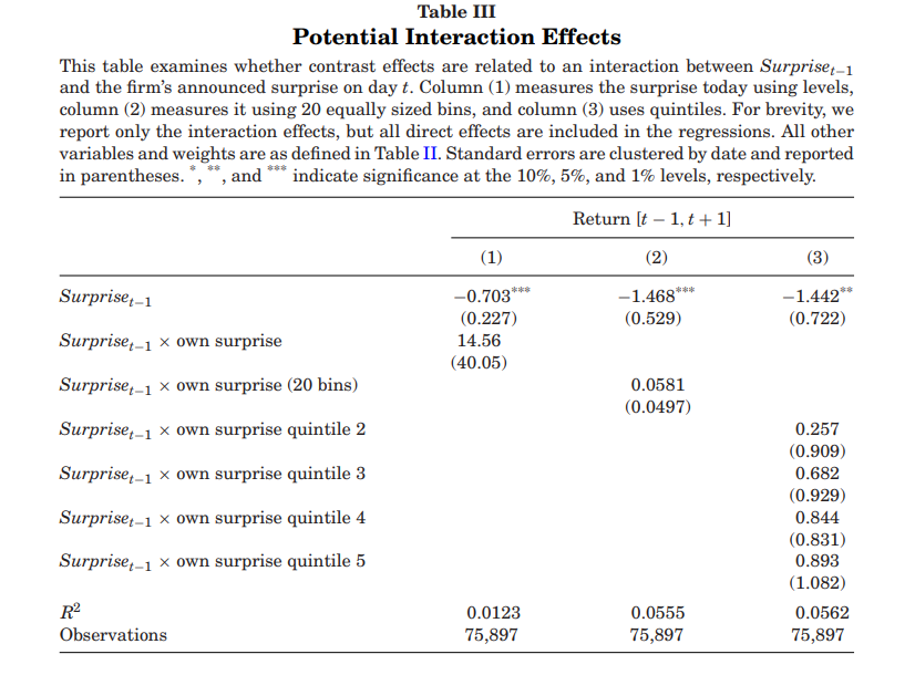 在表3中,作者直接测试了潜在交互效应,通过将前一天的盈余意外 与公司自身盈余意外的各种度量(原始值、20个区间、五分位数)进行交互。研究发现,当天的盈余意外更加负面时,对比效应的幅度可能略有增加,但这些交互效应均非显著不为零。此外,即使考虑了交互效应,作者仍然发现回报与前一天盈余意外之间存在强烈的负相关关系。换句话说,前一天的盈余意外负面影响了当天盈利公告的回报反应,但这种扭曲的程度并不显著依赖于当天的盈余意外水平。因此,研究关注直接的对比效应,而并不声称排除那些可能存在于数据中但由于噪声太大而难以准确估计的交互效应。