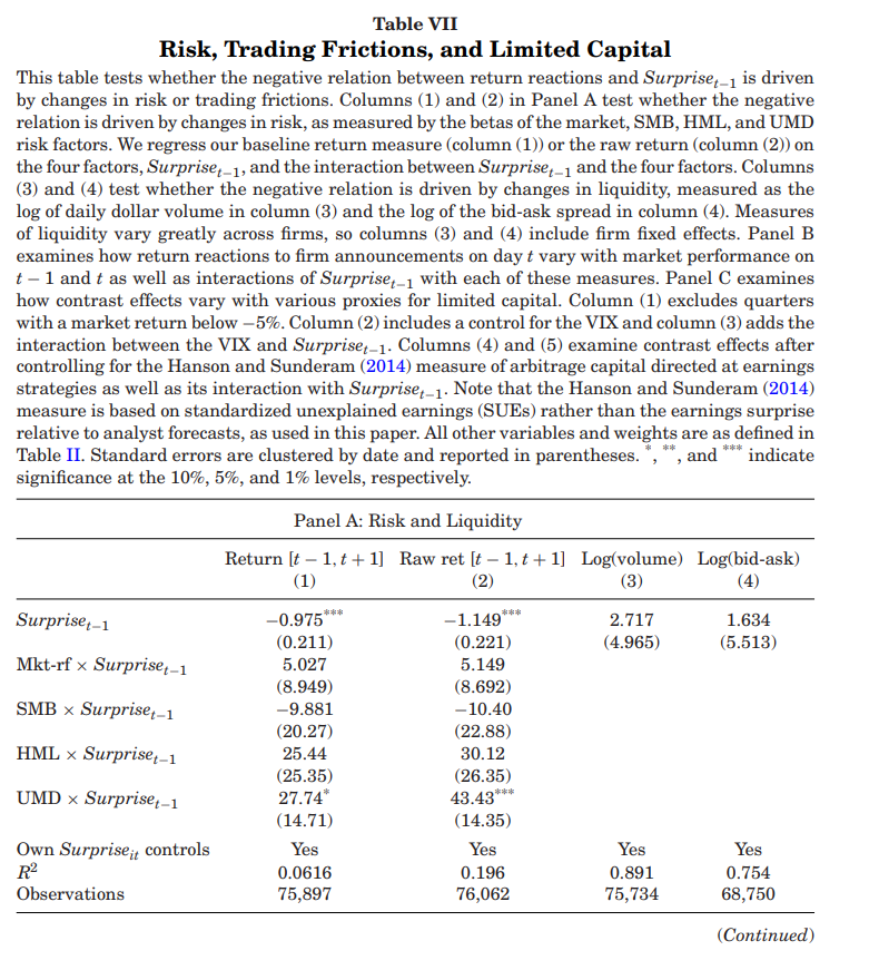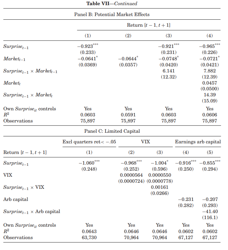 作者进一步分析了与有限资金相关的解释的可能性,尤其是关注那些专注于盈利套利的投资者的资金限制。表7的Panel C探讨了三种与套利资金限制相关的解释,其中之一是在市场下跌期间,套利资金可能更为有限。例如,2008年第四季度市场回报为-22%,而对比效应策略在此期间产生了较高的回报。研究显示,即使排除市场回报低于-5%的季度,仍然能够发现显著的对比效应。接着,作者考察了VIX对于对比效应的影响,发现即使在控制了VIX及其与 的交互作用后, 仍对发布盈利公司的回报反应有显著负面影响。