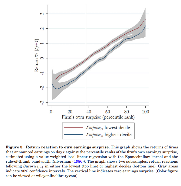 这个回归模型对之前的方程进行了两方面的修改:首先,作者将回报窗口扩展至 公布之前(即从t-2日开盘开始测量),这样一来,负 不会因为t日公司的公告发布后回报的过度反应和修正而导致。其次,作者控制了公司自身的盈余意外影响。通过将公司盈余意外的大小划分为20个相等的区间(bins),作者可以灵活控制这些区间,并非参数地允许每个区间与不同的平均回报水平相关联。