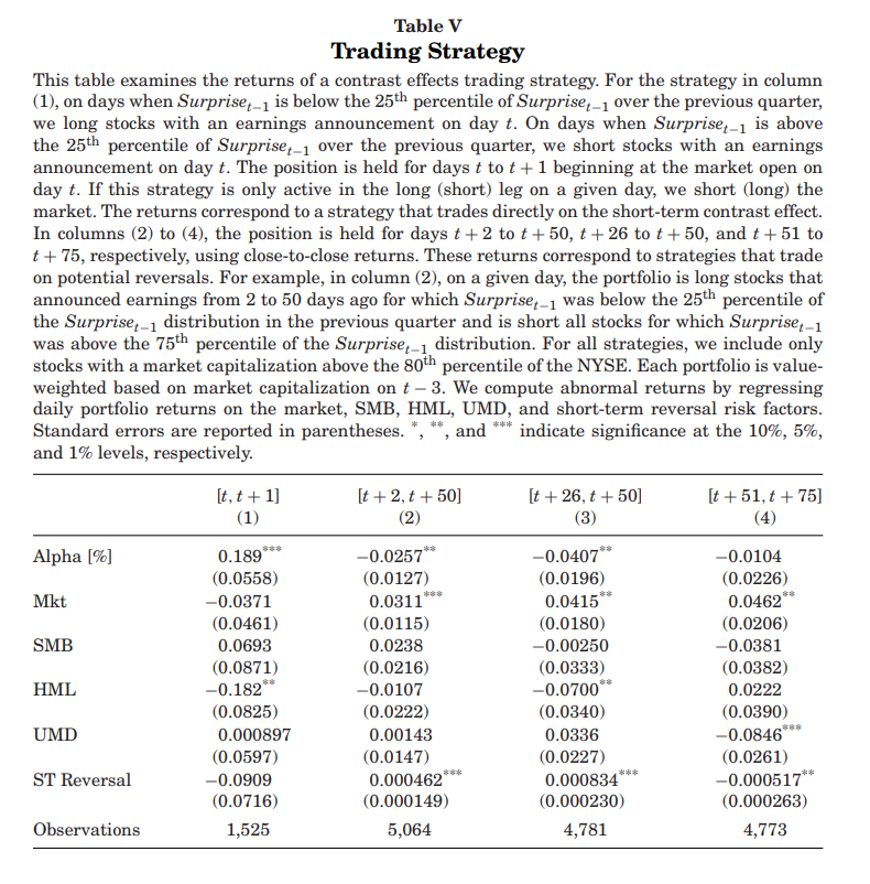 初步结果的一个重要含义是,当不考虑公司的自身盈余意外时,可以利用前一天可获得的信息预测t日及未来的回报。这一结果表明,可以基于前一天的盈余意外进行交易,并为预定在下一天发布盈利公告的公司赚取可预测的更高或更低的回报。为验证这一点,作者构建了一个基于对比效应的简单日历时间交易策略。