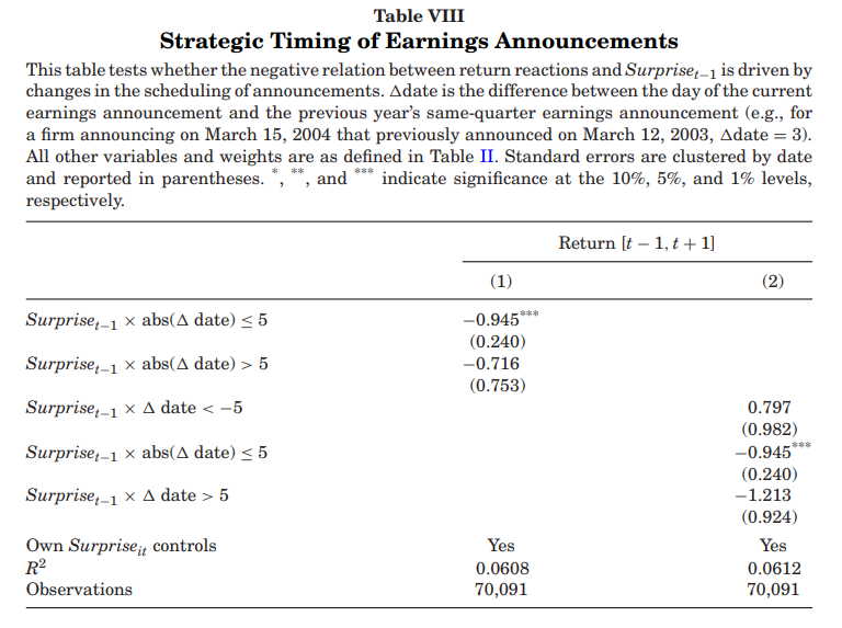 为直接测试策略性时机选择的影响,作者分别考察了那些相较于前一年同一季度的公告日,移动或保持不变的公告时间的公司。公司通常每年在大致相同的日期发布盈利公告,只有小幅变化,例如每年在同一天发布。因此,对应于策略性时机选择的解释,应该是那些偏离其正常公告日期的公司在驱动结果。作者将公司定义为那些相较于之前的同季度日期前后移动五天或以上的公司。大约80%的公司保持日期不变,10%公司将日期提前超过五天,10%公司则将日期推后。