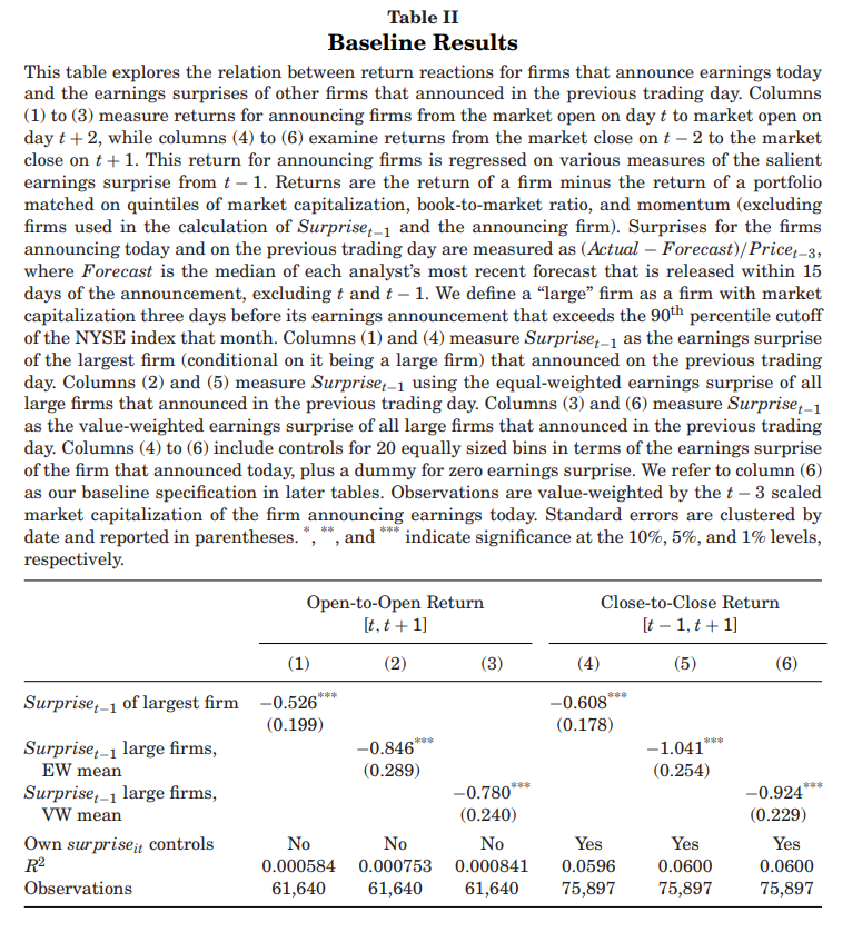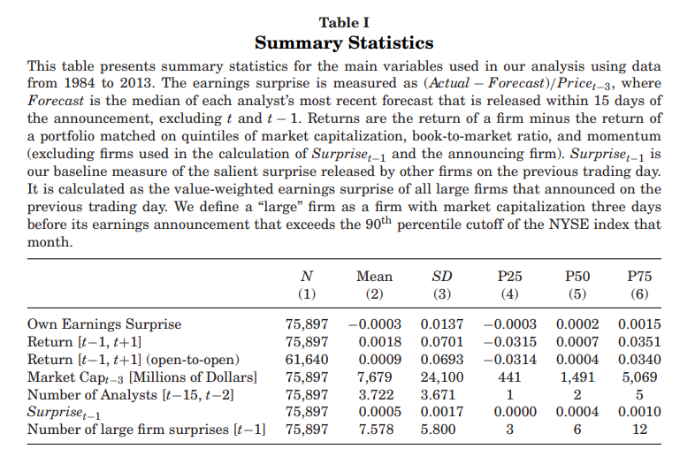 作者使用的数据涵盖了从1984年到2013年的样本期。主要分析集中于控制了公司的自身盈余意外后,公司在t日发布盈利公告时,其回报反应与前一天(t-1)其他公司发布的盈余意外之间的关系。