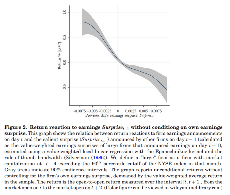 作者的主要发现如图1所示,图中展示了公司盈利公告前后回报率与前一个交易日大型公司的加权平均盈余意外之间的负相关关系:在控制当天的盈利新闻后,回报率对当天盈利公告的反应与前一天的盈余意外 成反比。该效应的影响是相当大的,前一天盈余意外的十分位数组的两个极端组对应的当天盈利公告回报的差值为53个基点。