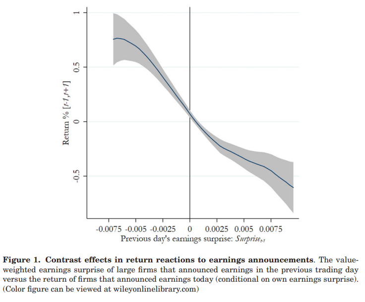 论文提供了在复杂金融市场中对比效应的证据:投资者将当前盈利公告中的信息与之前的内容进行对比,错误地将当前的盈利公告解读为(与实际情况相比)更好或更差的信息。也就是说,市场价格不仅仅是对新闻的绝对内容做出反应,而且会受到新闻内容的相对变化的影响。