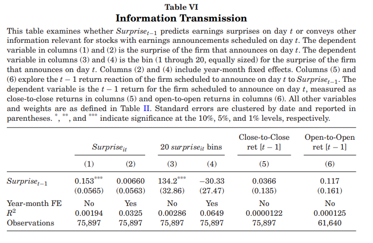 此外,作者发现,日常风险因子暴露的变化、回报波动率、交易量和其他交易摩擦的度量指标并未随着前一天的盈余意外 而变化。最后,作者还探讨了公司是否会策略性地提前或推迟盈利公告,或者操纵盈利公告本身,结果发现,即使在不太可能从事此类行为的公司子样本中,也得到了类似的结果。