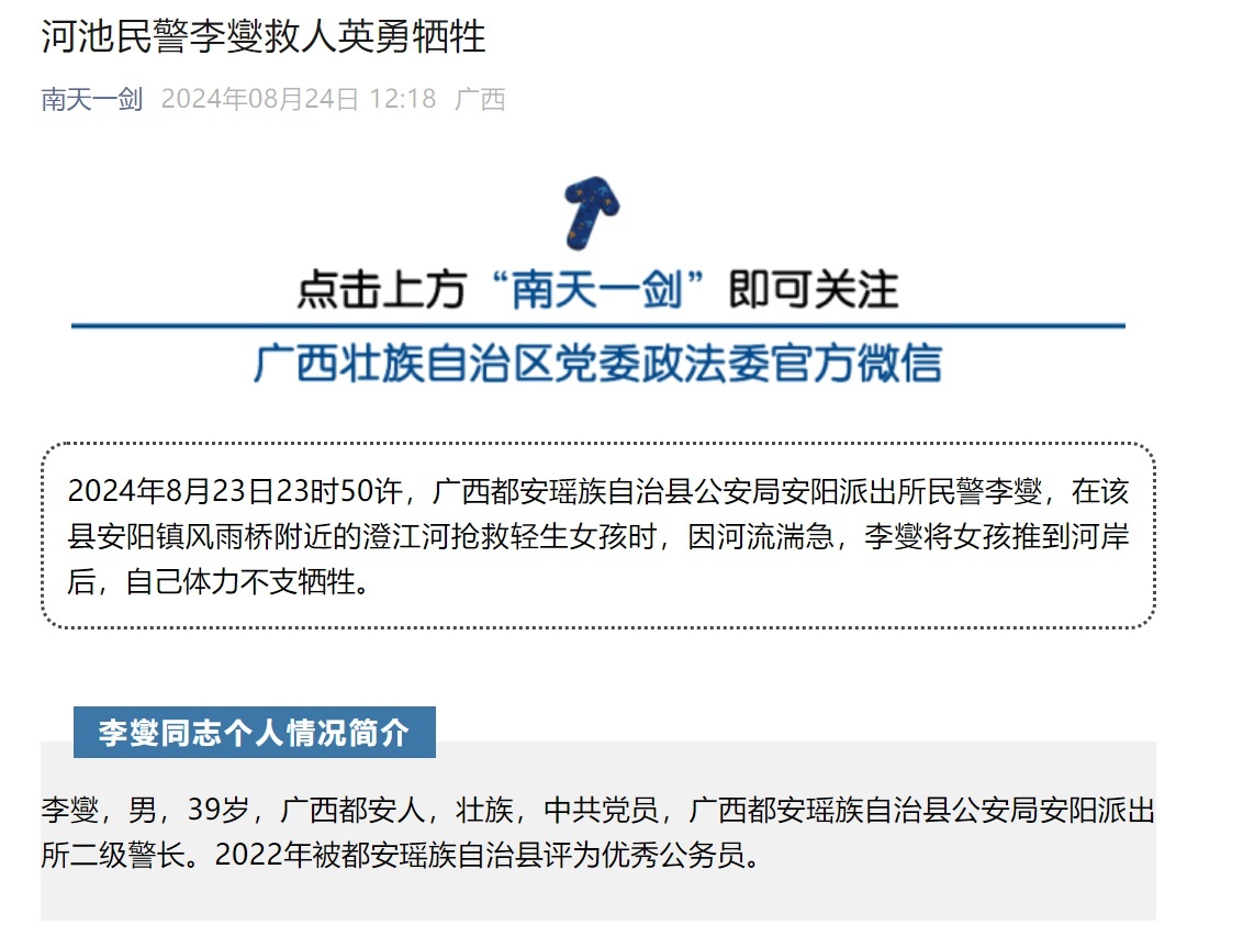 据南天一剑微信公众号,2024年8月23日23时50许,广西都安瑶族自治县公安局安阳派出所民警李燮,在该县安阳镇风雨桥附近的澄江河抢救轻生女孩时,因河流湍急,李燮将女孩推到河岸后,自己体力不支牺牲。李燮,男,39岁,广西都安人,壮族,中共党员,广西都安瑶族自治县公安局安阳派出所二级警长。2022年被都安瑶族自治县评为优秀公务员。