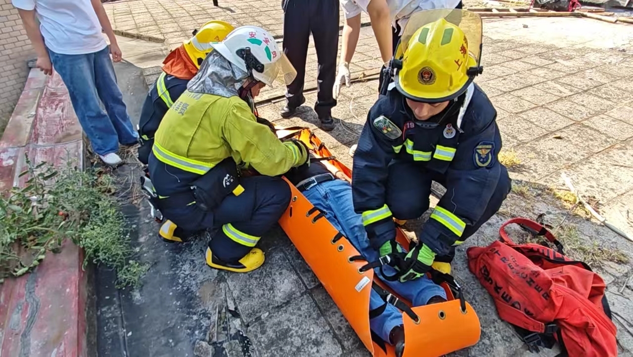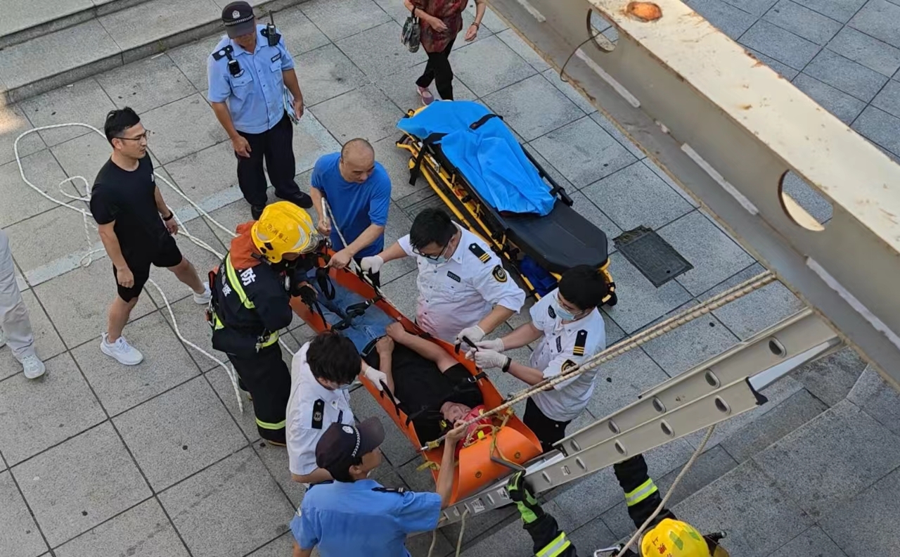了解现场情况后,消防救援人员立即架设金属拉梯,携带多功能担架至平台,将被困男子固定后通过绳索装置转移到一楼安全区域,并现场移交至120医护人员。