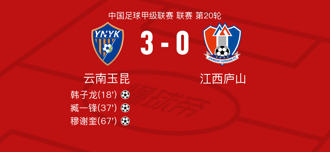 北京时间8月24日,中国足球甲级联赛第20轮,云南玉昆主场迎战江西庐山。比赛中,云南玉昆的韩子龙率先打破僵局,随后他又助攻臧一锋再下一城。穆谢奎的进球为球队锁定胜局。最终,云南玉昆以3-0战胜江西庐山。