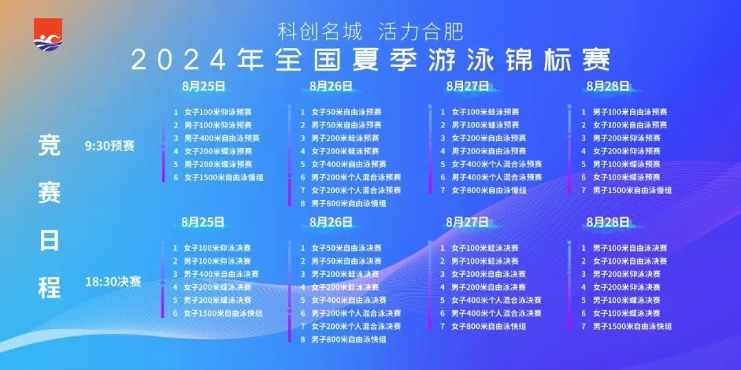 8月25日至28日,每个比赛日9:30预赛、18:30决赛。在为期4天的比赛中,观众将可以在合肥体育中心游泳馆亲眼目睹一批泳坛未来之星的风采。