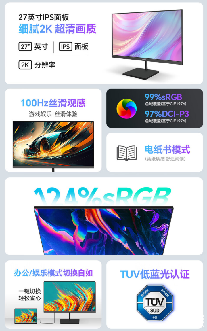 盛色OF27Q显示器配备了一块27英寸的IPS屏幕,分辨率为2560×1440,可视角度178°,最高支持100Hz刷新率,峰值亮度300尼特,支持10bit色深。在色准方面,这款显示器支持99%sRGB色域覆盖、97%DCI-P3色域覆盖、94%AdobeRGB色域覆盖,官方宣传这款显示器的ΔE≤2。在护眼方面,这款显示器获得了德国莱茵TÜV低蓝光认证,支持DC调光。盛色OF27Q显示器还支持电纸书模式,官方宣称这款显示器启用该模式后将呈现类纸张的显示效果,可有效缓解眼睛在阅读时的不适感。