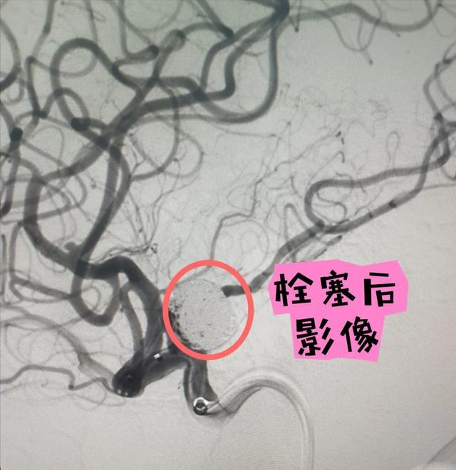 在影像引导下,主刀医师冯铁桥教授通过微导管分别在动脉瘤中填入大小不等14个弹簧圈,造影显示动脉瘤被堵塞致密,脑动脉血液通畅。患者术中、术后神志镇静,状态平稳,无明显不适,安返病房。