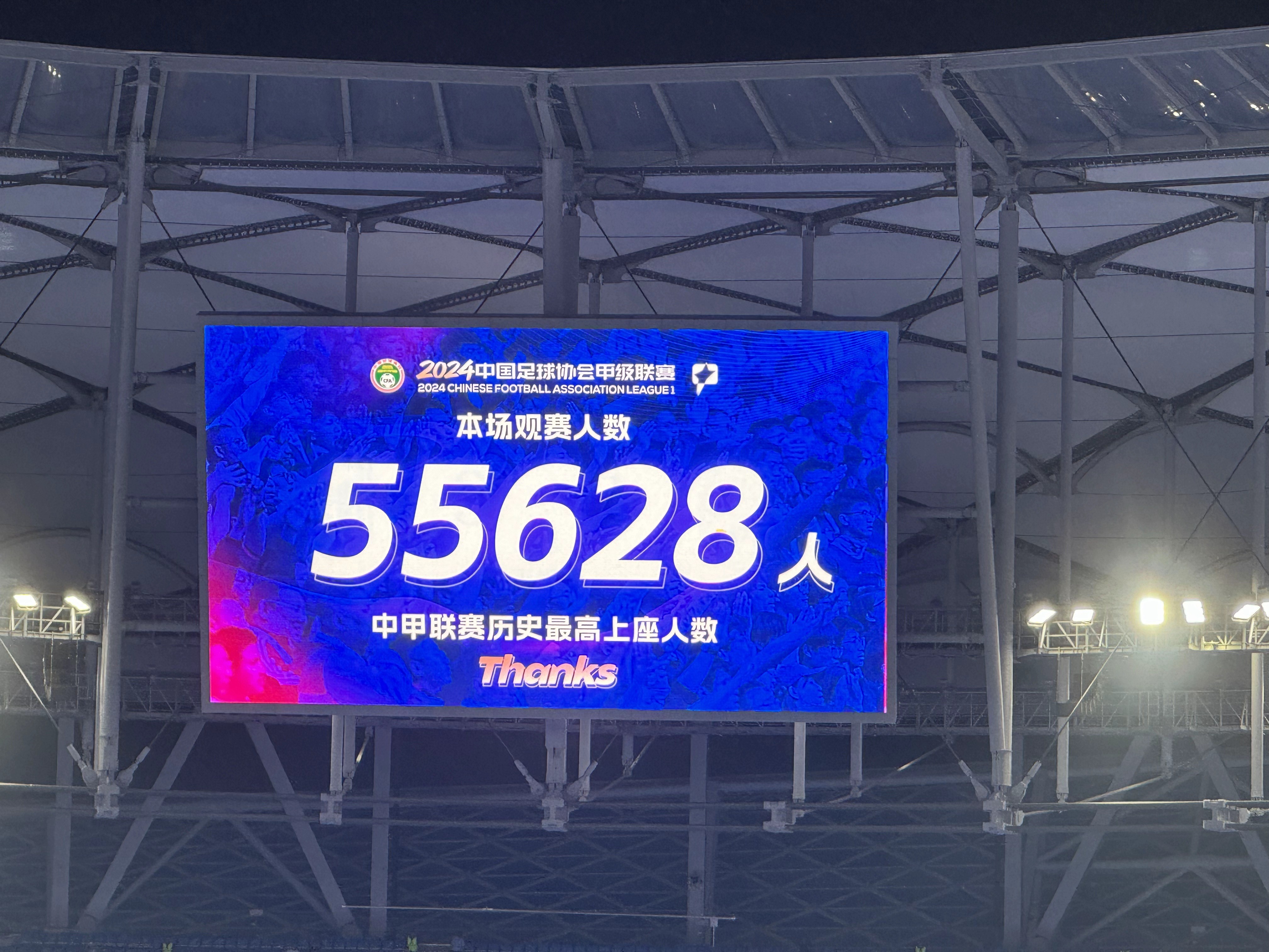 据现场播报,本场比赛现场观众人数为55628人,打破了今年7月13日大连英博2-0苏州东吴时创下的55016人纪录,刷新了中甲历史单场现场观众人数纪录。