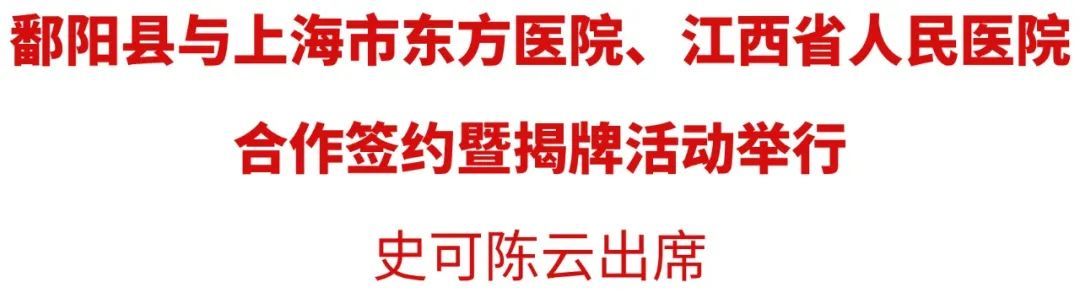 8月24日,鄱阳县与上海市东方医院、江西省人民医院合作签约暨揭牌活动举行。副省长史可,中科院院士、同济大学副校长、上海市东方医院院长陈义汉为上海市东方医院鄱阳医院揭牌并讲话;市委书记陈云、省卫健委副主任李中坚为江西省人民医院鄱阳医院揭牌。
