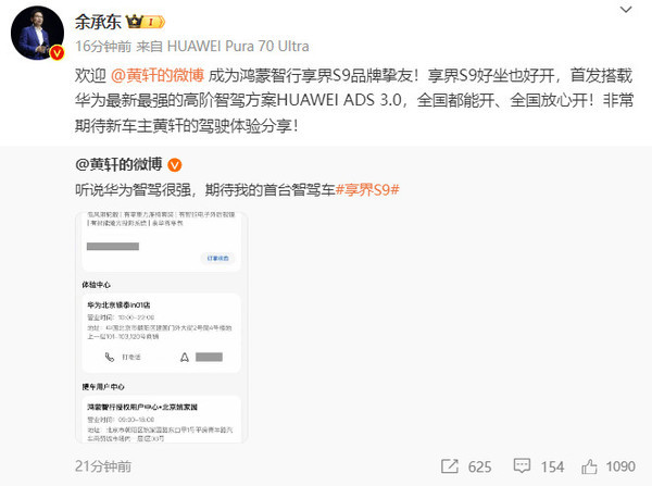 余承东发微博称,欢迎 @黄轩的微博 成为鸿蒙智行享界S9品牌挚友!享界S9好坐也好开,首发搭载华为最新最强的高阶智驾方案HUAWEI ADS 3.0,全国都能开、全国放心开!非常期待新车主黄轩的驾驶体验分享!