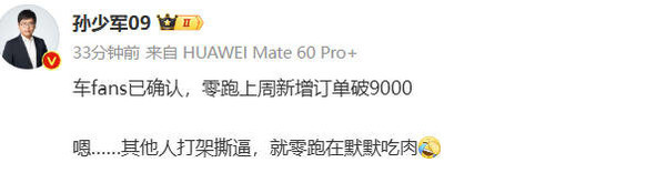 8月26日,汽车行业分析师孙少军透露,零跑汽车上周新增订单高达9000份,疑似为上周新势力新增订单数据第一名:“其他人打架撕逼,就零跑在默默吃肉”。