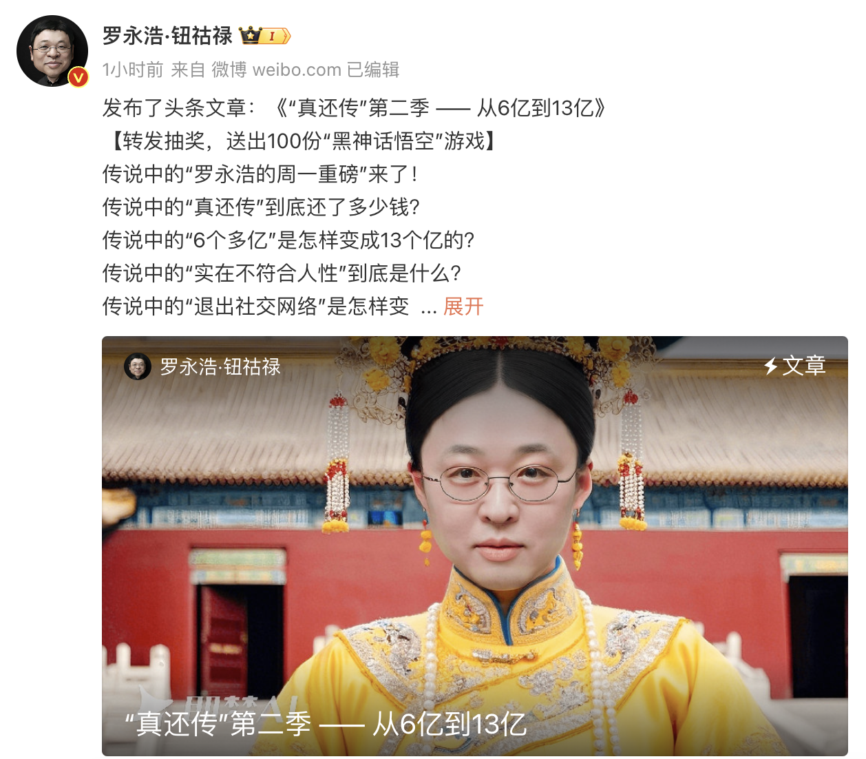 2024年8月26日上午,11点11分。罗永浩在微博用 @罗永浩・钮祜禄发布《“真还传”第二季 —— 从 6 亿到 13 亿》,其中提到: