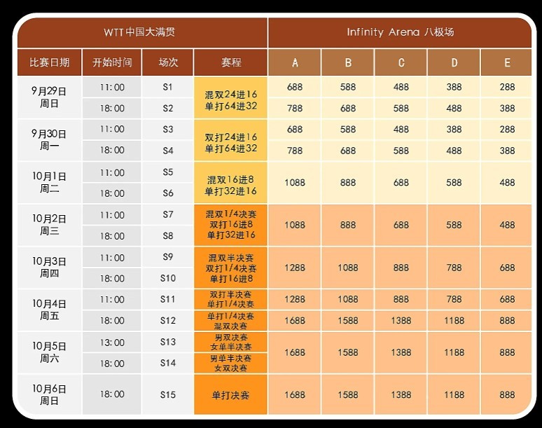 北京时间8月26日,2024年WTT中国大满贯门票价格公布,最后两个比赛日的门票价格为888元-1688元。