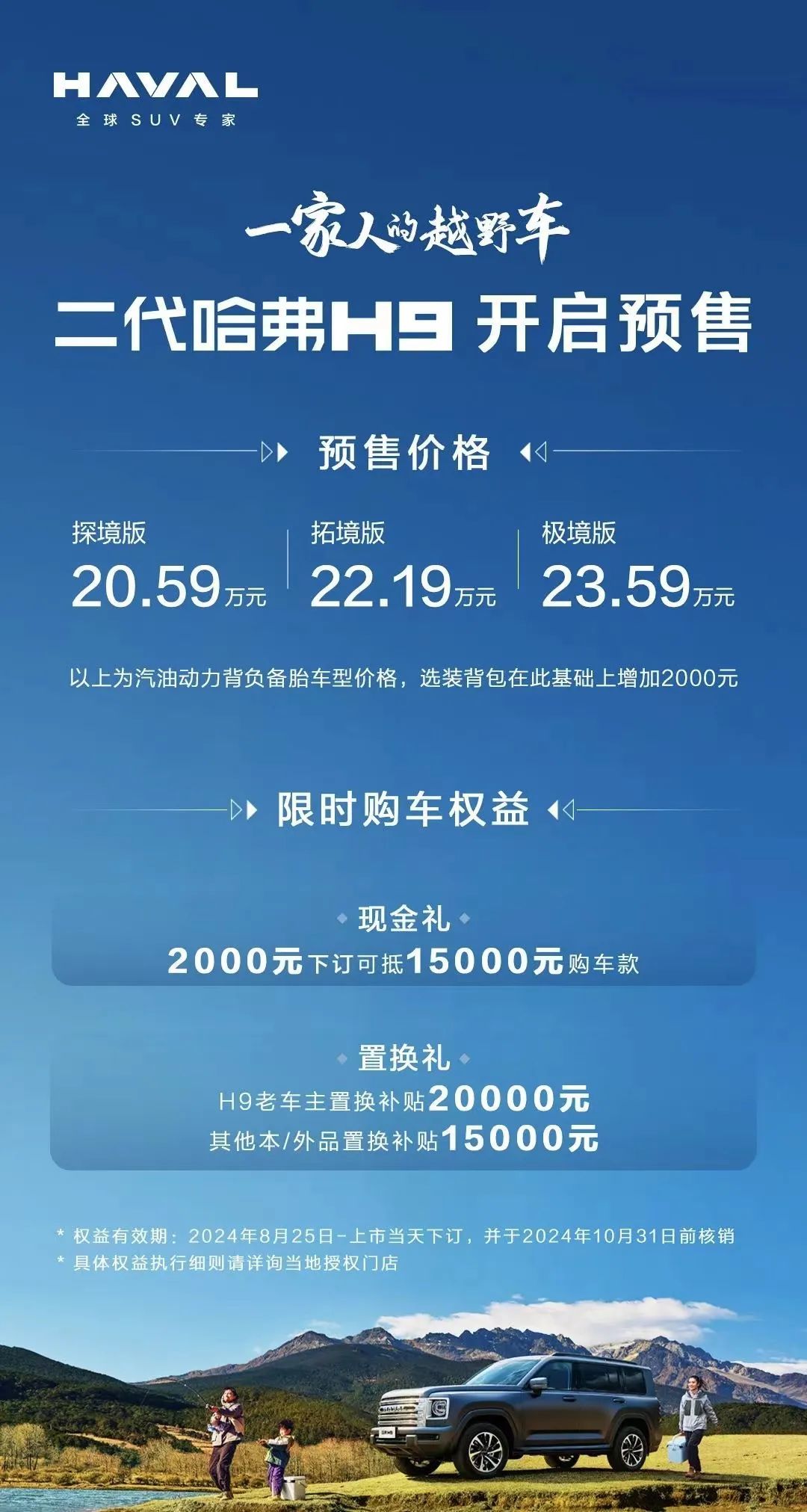 8月25日,全新一代哈弗H9正式开启预售,新车一共带来了3款车型,预售价格为20.59-23.59万元。通过预售价格来看,全新一代哈弗H9是要比现款以及上一代车型的门槛都要更低的。预售政策方面,现在下订还可享限时购车权益,分别是2000元下订可抵15000元购车款的现金礼,以及H9老车主置换补贴20000元、其他本品或外品置换补贴15000元的置换礼(权益有效期:2024年8月25日-上市当天下订,并于2024年10月31日前核销)