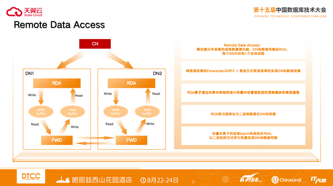 Remote Data Access解决重分布场景的进程数暴增问题,DN间数据传输走RDA,1 个分布式会话在每个DN只会有1个会话进程。网络通信模块Forwarder以RPC + 推送方式更高效率的实现DN间数据传输。
