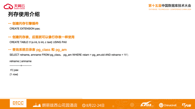 列存使用过程非常简单,先创建列存引擎插件,创建列存表,后面就可以像行存表一样使用,可以查询系统目录表 pg_class 和 pg_am可以确认表的存储引擎。