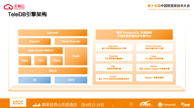 TeleDB引擎架构如图所示,它是基于PostgreSQL开放架构,打造冷热分离的多引擎平台。