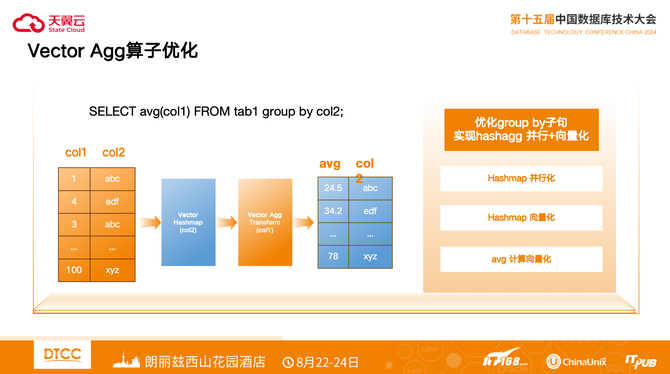 上图展示了通过优化group by子句,来实现hashagg并行+向量化的过程。