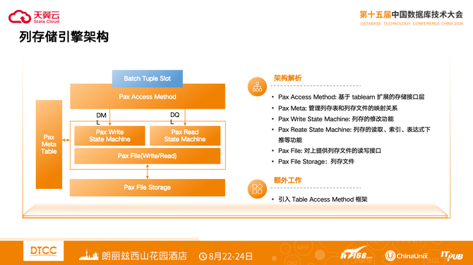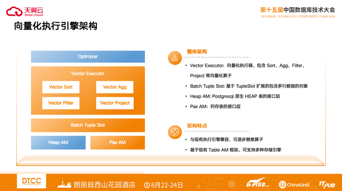 整体架构包括Vector Executor向量化执行器,其包括:Sort、Agg、Filter、Project等向量化算子;Batch Tuple Slot基于TupleSlot扩展的包含多行数据的对象;列存表的接口层Pax AM。