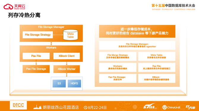 File Storage Manager负责列存文件存储位置管理的bgworker,周期性地根据不同的策略调整,对符合规则的文件进行降冷处理。中间通过XBlock块缓存服务访问外部对象存储,在加速IO 的同时,屏蔽不同对象存储协议的差异。