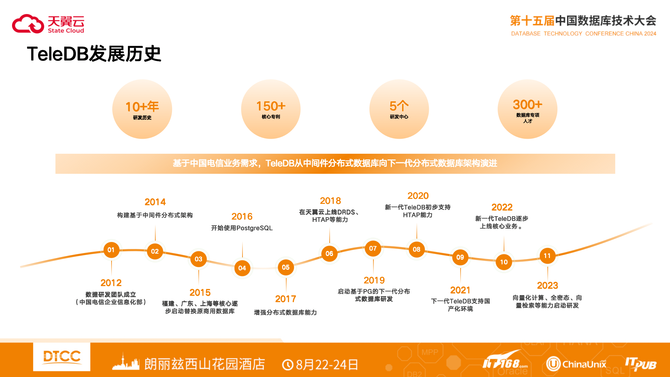 回顾天翼云自研数据库的发展历史,不难发现其深厚的底蕴与持续的创新。早在2012年,中国电信率先组建了专业的数据研发团队。之后的十余年,基于中国电信业务需求,TeleDB从中间件分布式数据库向下一代分布式数据库架构演进。