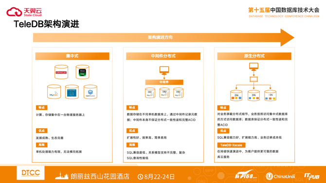 TeleDB架构演进方向和业界相同。首先是集中式,基于发展成熟、生态完善的MySQL、PG开源数据库,可以快速替换非核心系统,但是单机处理能力有限,无法横向拓展。