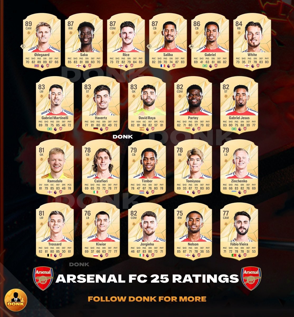 FC25阿森纳能力值遭到泄露,厄德高89,萨卡、赖斯、萨利巴并列87。