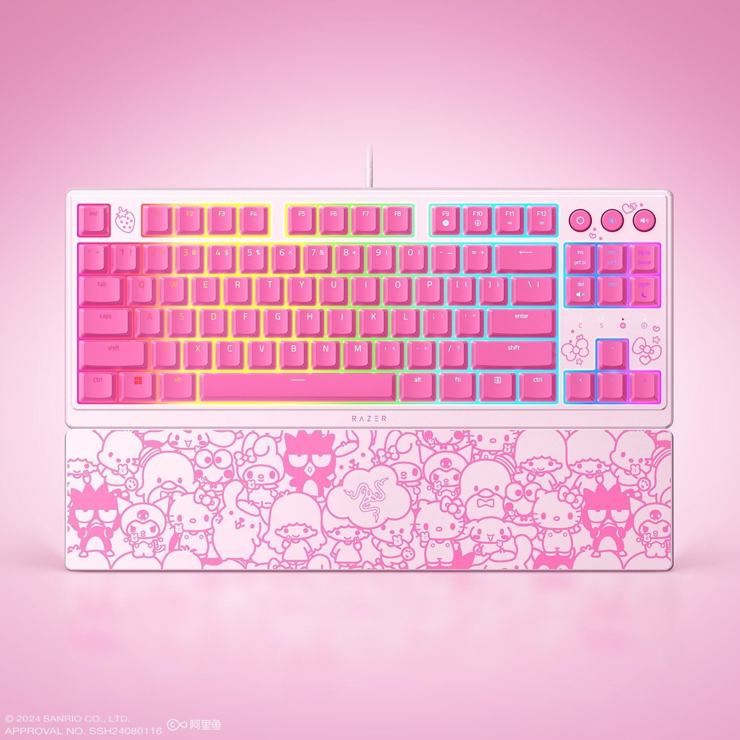 Sanrio characters 限定款键盘包含了键盘本体和腕托两个部分,是有线键盘,轮询率达到了 1000Hz;它采用了 87 键紧凑设计,没有数字小键盘;它搭载了雷蛇轻机械技术的按键,与我们熟知的机械键盘轴体不同,但据称会有接近机械轴的利落反馈。