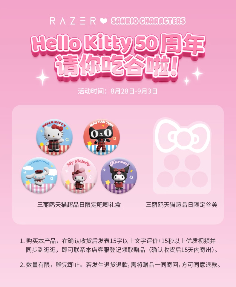 另外,雷蛇还推出了一个全套大礼包,包含上面谈到的四款产品,定价 1999 元,到手后完成一些评价任务还会赠送三丽鸥天猫超品日限定吧唧礼盒和限定谷美。