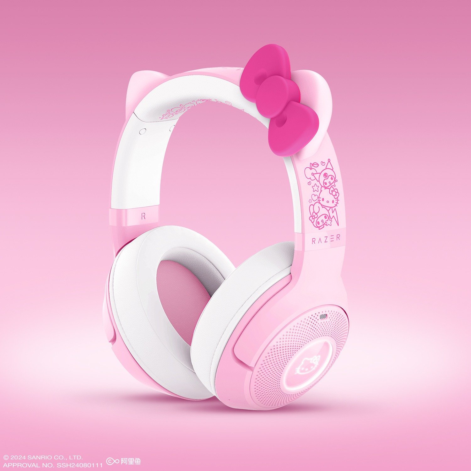 这款系列产品包含了耳机、鼠标、键盘和鼠标垫四款产品。其中耳机采用了凯蒂猫的猫耳和蝴蝶结元素,搭载了 40mm 的 TRIFORCE 驱动单元与内置波束成型麦克风,并且是无线设计,定价为 899 元。