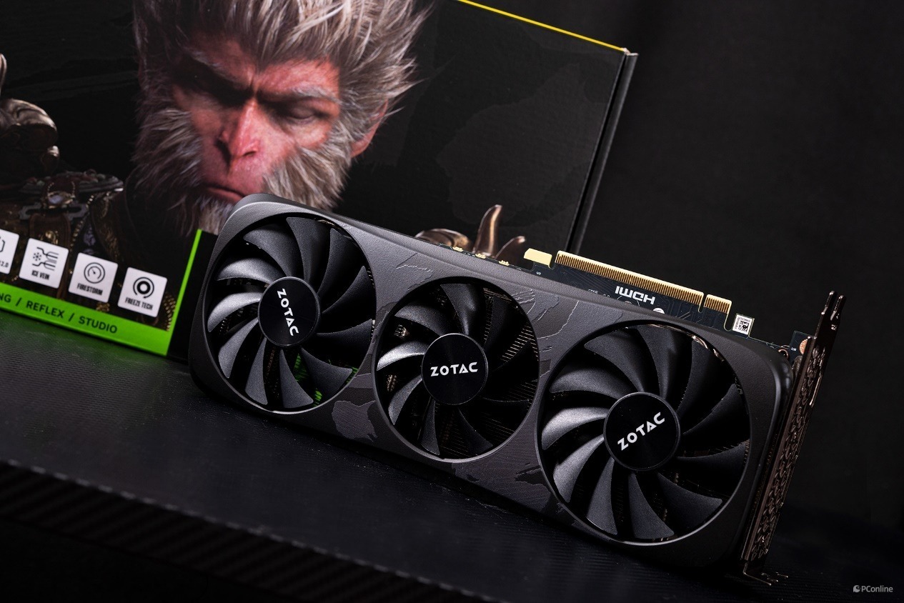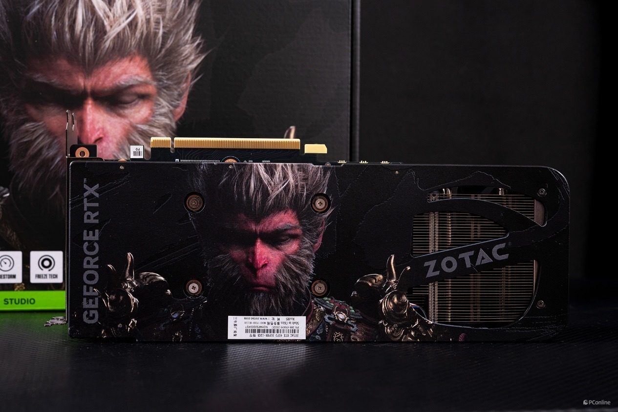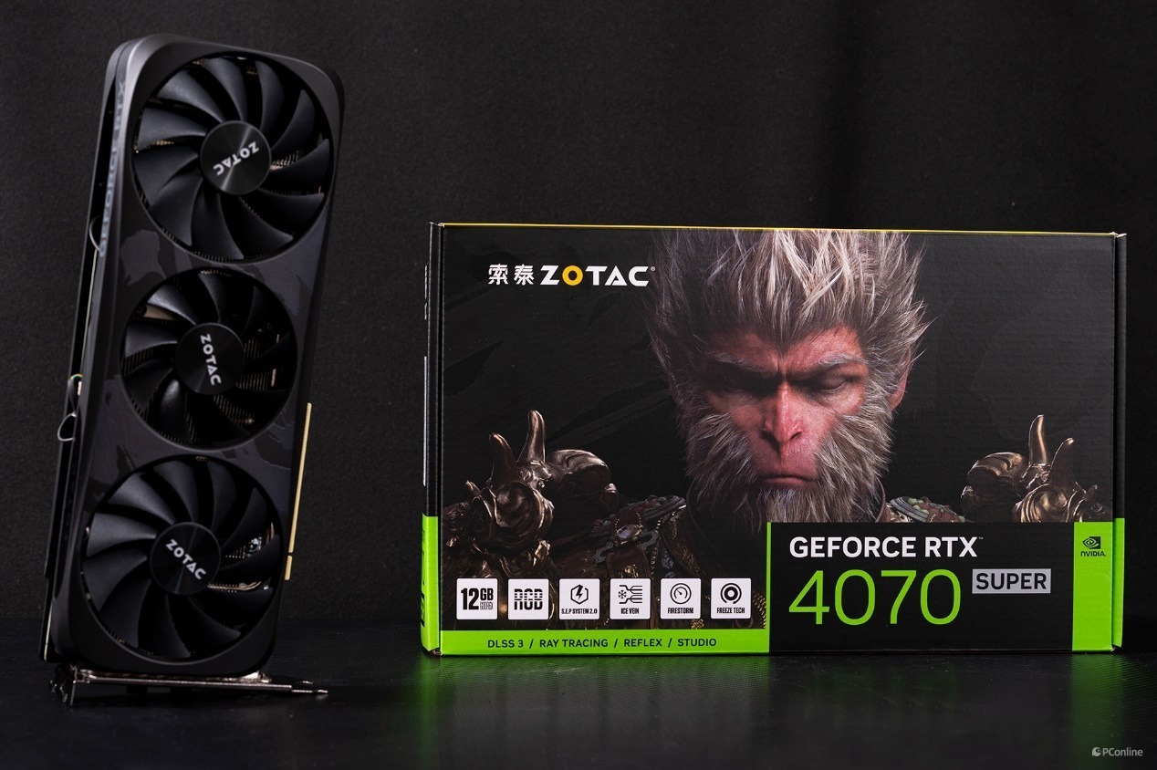整套配置最重要的当属显卡了,众所周知《黑神话:悟空》是一款极其吃显卡性能的游戏,所以想要畅玩西游,做齐天大圣少不了高性能显卡。我们的测试主角就是定位2K高帧游戏的索泰GeForce RTX 4070 SUPER 12GB 悟空显卡,它是由索泰、NVIDIA及游戏科学官方推出的定制显卡,外观颜值在线,视觉设计前卫。