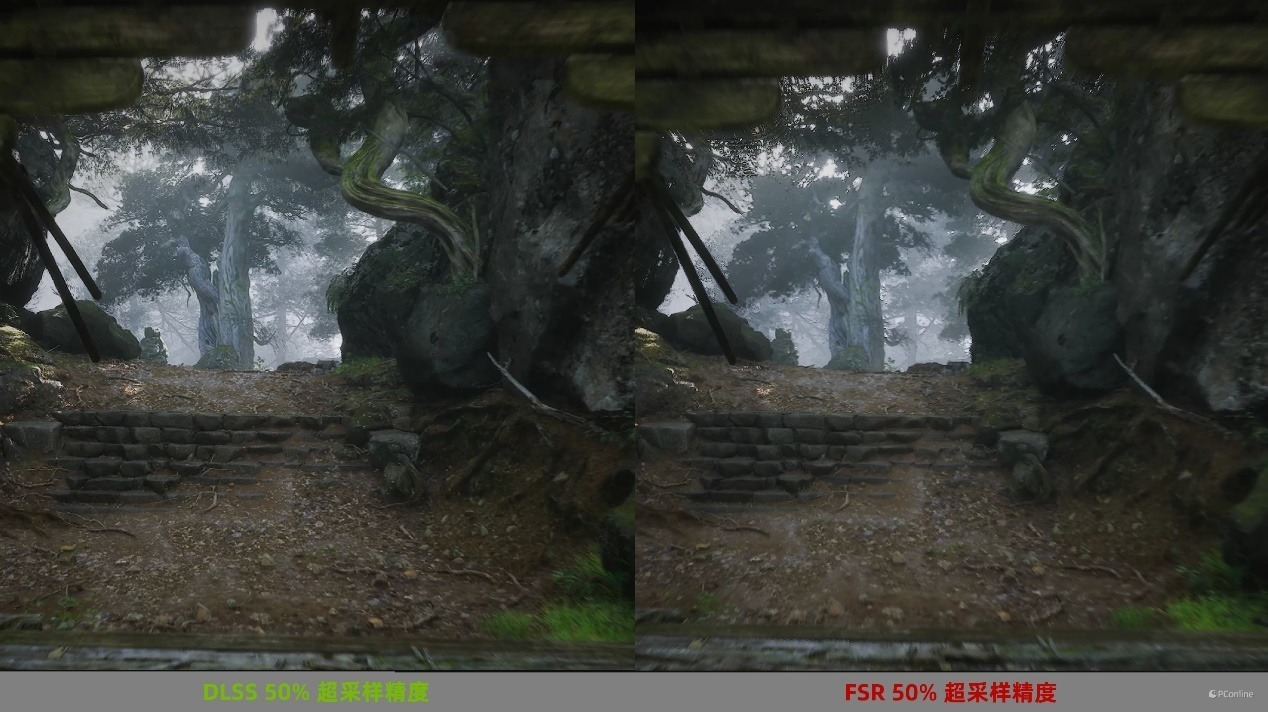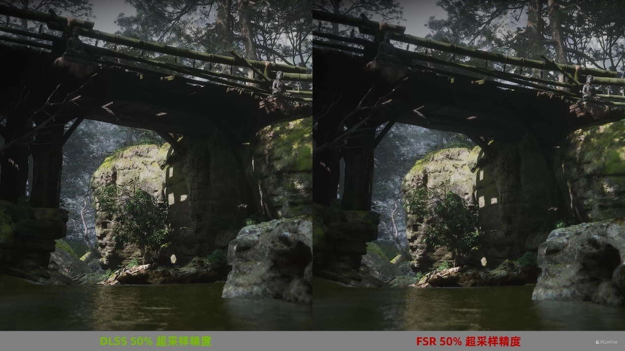 虽然都是超分辨率技术,但实际还是有区别的。就拿玩家最常用的DLSS与FSR来看,可以看到DLSS中无论是背景茂密的树木还是前面岩石旁的植被都更生动一些,而FSR中的画面则多了一丝涂抹感,视觉效果稍差一些。