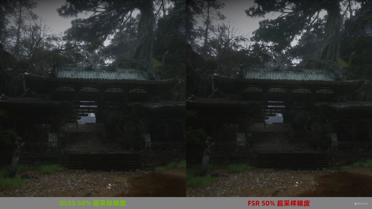 下面这个场景就更明显了,仔细看屋檐上的纹理就知道了。同样是50%的超采样精度,但是DLSS的画面就是更清晰,屋檐砖缝的纹理清晰可见,而FSR的画面里就显得有些模糊了,对于追求画质的玩家来说,这一点还是比较影响观感的。
