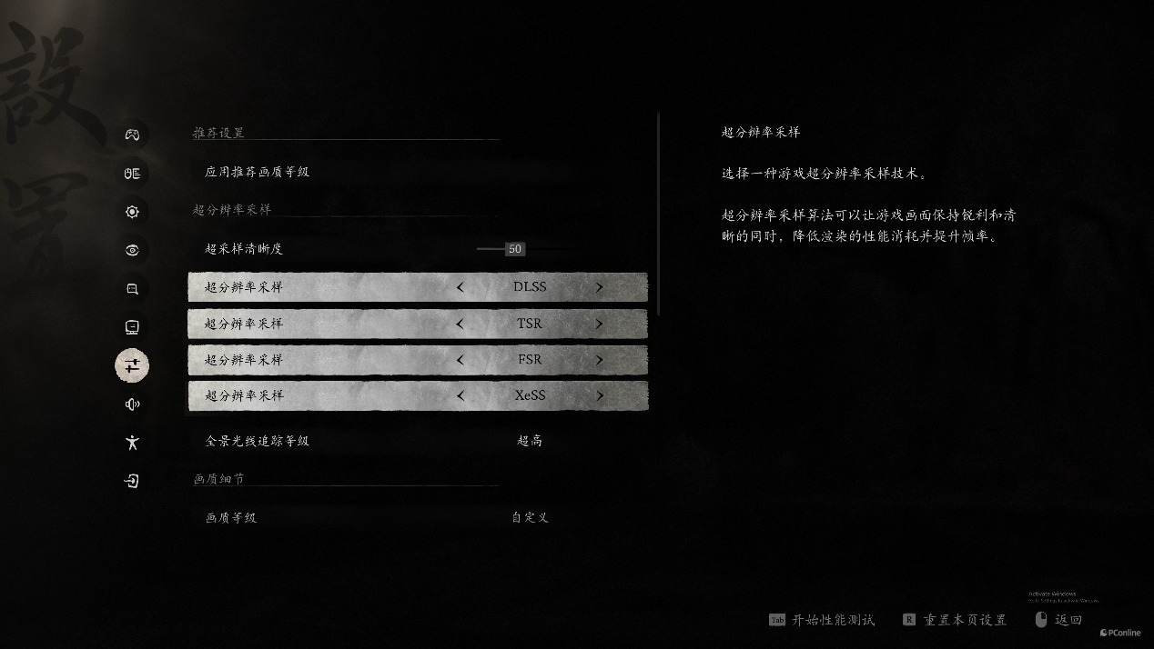 另外,由于《黑神话:悟空》这款游戏精美的画面与逼真的光追效果,想要畅玩的话,不开超分辨率技术是不太行的。之前我们实测RTX 4090都很难在原生画质下征服这款游戏。因此上面的测试我们都开启了DLSS 3技术。不过这款游戏除了有DLSS 3,还有诸如TSR、FSR以及XeSS等超分辨率技术。