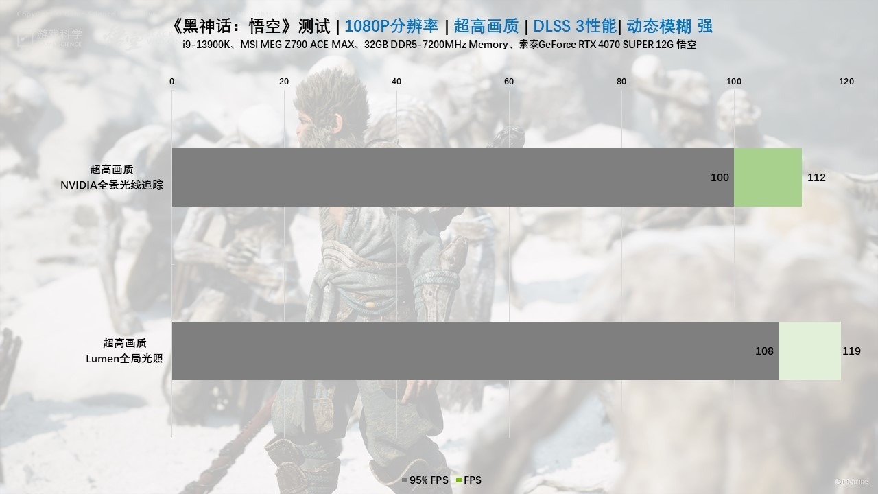 1080P下,我们测试了上面提到的两种光追方案,分别是Lumen全局光照以及NVIDIA全景光线追踪。实测索泰GeForce RTX 4070 SUPER 12G悟空征服1080P还是轻轻松松的,两种设置都能轻松跑上100帧以上。特别是在压力更大的NVIDIA全景光线追踪设置下,帧率依旧稳定在112 FPS,基本已经满足高刷游戏的需求了。