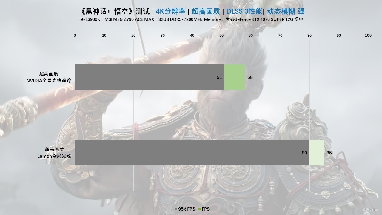 最后就是4K分辨率了,虽然索泰GeForce RTX 4070 SUPER 12G悟空是一款定位2K高帧游戏的显卡。不过其似乎也能挑战一下4K游戏,在Lumen全局光照的设置下,它能够在超高画质下跑到85 FPS,表现相当可观。但是NVIDIA全景光线追踪对显卡的压力就有些大了,加上4K超高画质的双重组合拳,索泰GeForce RTX 4070 SUPER 12G悟空只能勉强稳定在60 FPS附近,看来4K光追还得上更大显存更强核心的RTX 4070 Ti SUPER才行。当然索泰GeForce RTX 4070 SUPER 12G悟空也不是不能战,只是你要稍稍降低一档画质才行。