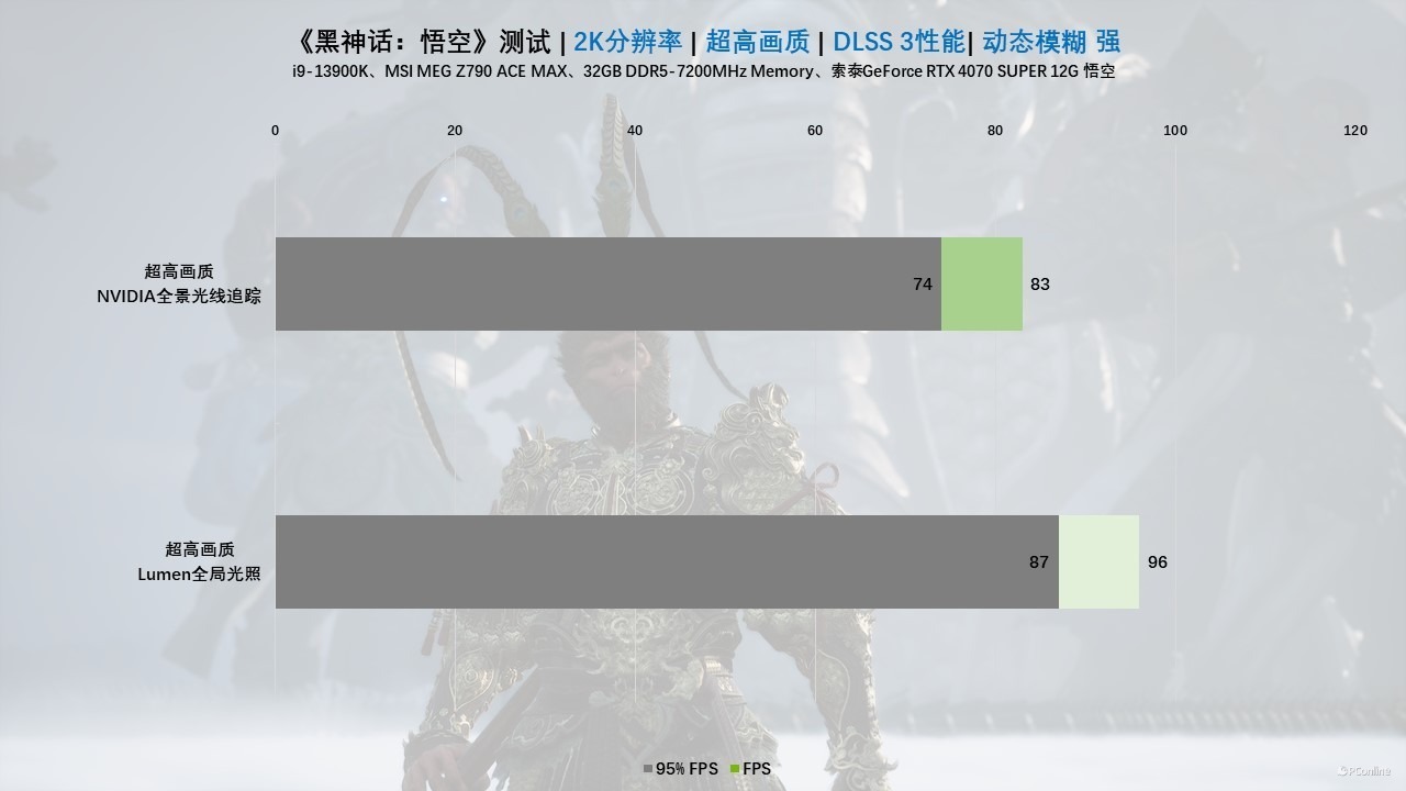 2K分辨率下,还是相同的设置。实测仅有Lumen全局光照时,索泰GeForce RTX 4070 SUPER 12G悟空可以跑到96 FPS,2K高帧运行《黑神话:悟空》轻轻松松。开启NVIDIA全景光线追踪以后,虽然帧数稍稍下降,但换来的画面质感想必刚刚你也见识过了,确实震撼。并且帧数表现也不错,还能稳定运行在83 FPS左右。你甚至可以将画质再进阶一步,以索泰GeForce RTX 4070 SUPER 12G悟空目前的表现,相信“影视级”画质也能2K60 FPS运行。