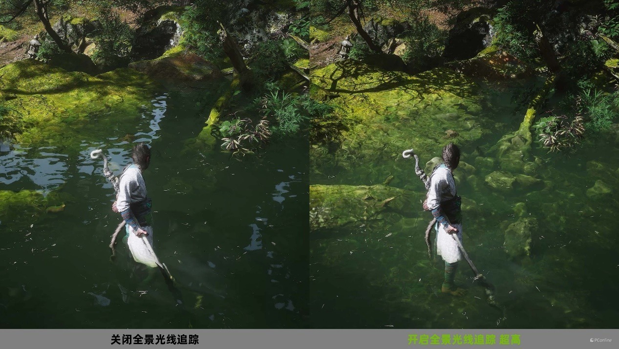 这一组对比就更明显一些了,在开启NVIDIA全景光线追踪后,画面发生了质的变化。其中水面的光影是比较明显的,光线穿过不平整的水面照在水底的石子堆上,呈现出了光线追踪焦散的效果,同时水面倒影的细节也变得更为丰富。除此之外,就跟我们上面说的一样,全景光线追踪能够把场景内光线反射两次,创造了更为真实的间接照明和遮蔽效果,清澈见底的水潭就是最好的证明。
