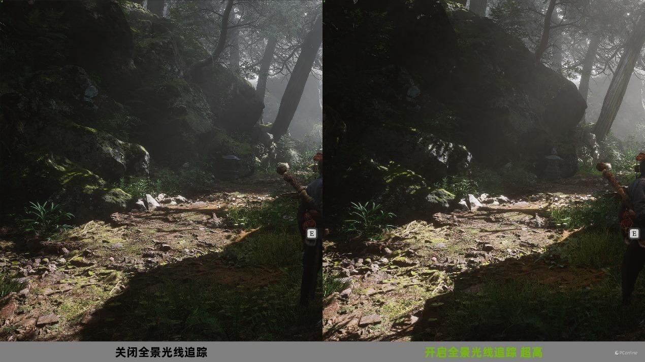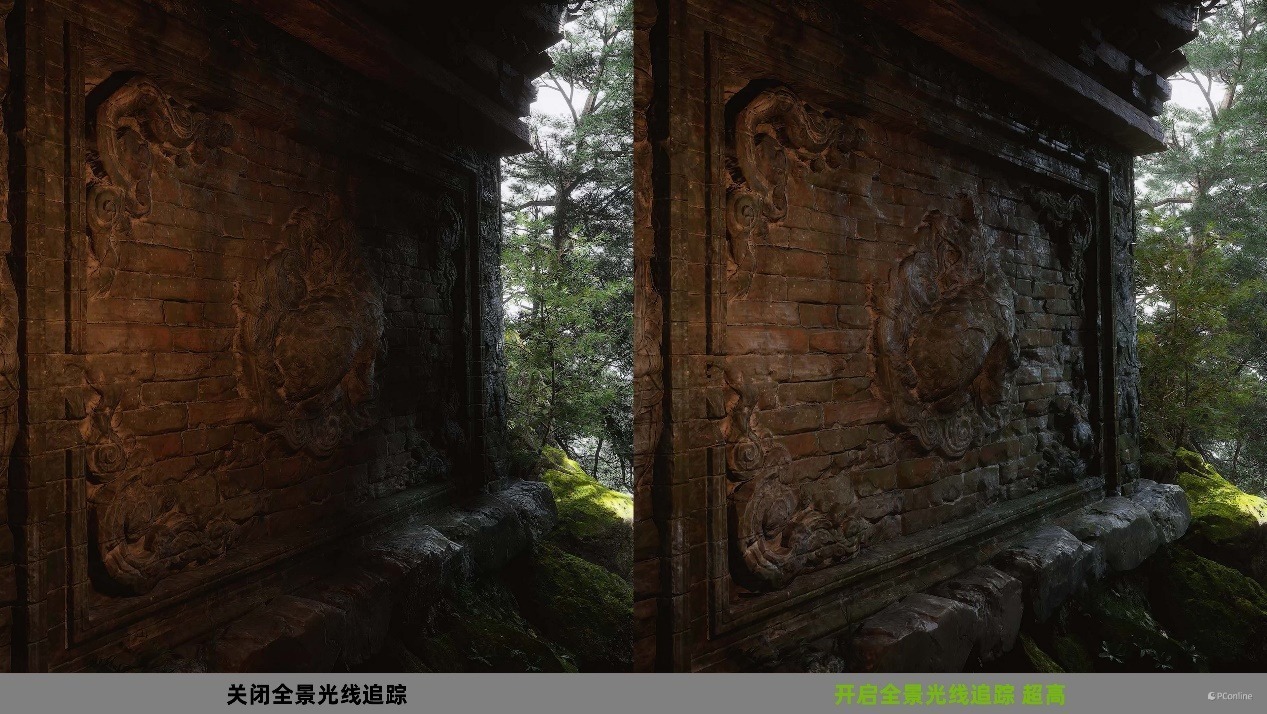 实际效果看图就知道了,我们在击败幽魂以后前往下一个地点时,穿过一处山洞,洞窟的墙壁上有精致细腻的雕塑。如果你不开启全景光线追踪的话,你其实很难看出雕塑的精致感,墙壁上的纹理也少了一些质感。开启全景光线追踪以后,山洞外的阳光照射在墙壁之上,有了一丝渐变的效果,墙壁左侧的火把也能照亮墙壁,两侧光线营造了出色的画质体验,这就是“多重反射光线追踪间接照明”的魅力。