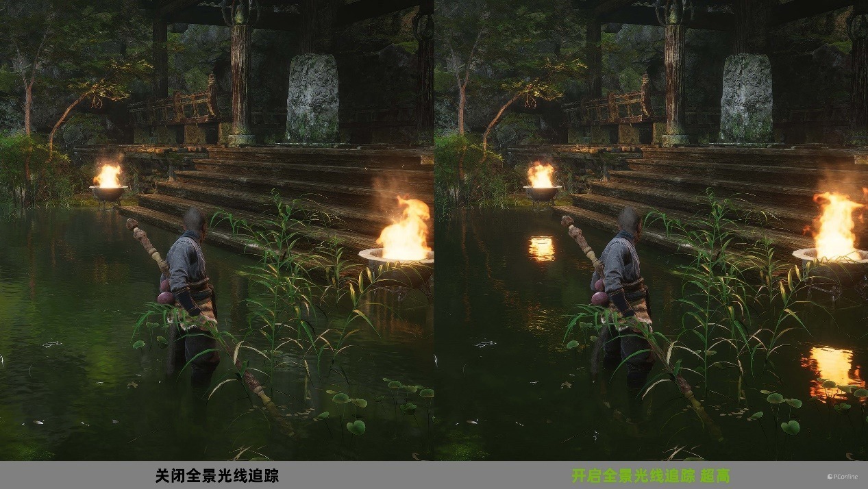 击败白衣秀士后,进入黑风洞之前,你可以注意到台阶的两侧有火盆存在。得益于全景光线追踪的应用,现在就连微小的粒子发光源也能有出众的光追效果,火焰的倒影能够清晰的反射在水面之上,并且窜动的火苗在水面的倒影也能随之摇曳,效果特别生动逼真,游戏画面提升到了一个新层次。